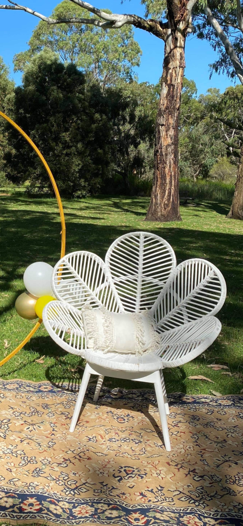 Peacock chair styling can be arranged at additional cost (faux foliage, faux flowers or balloon garland)